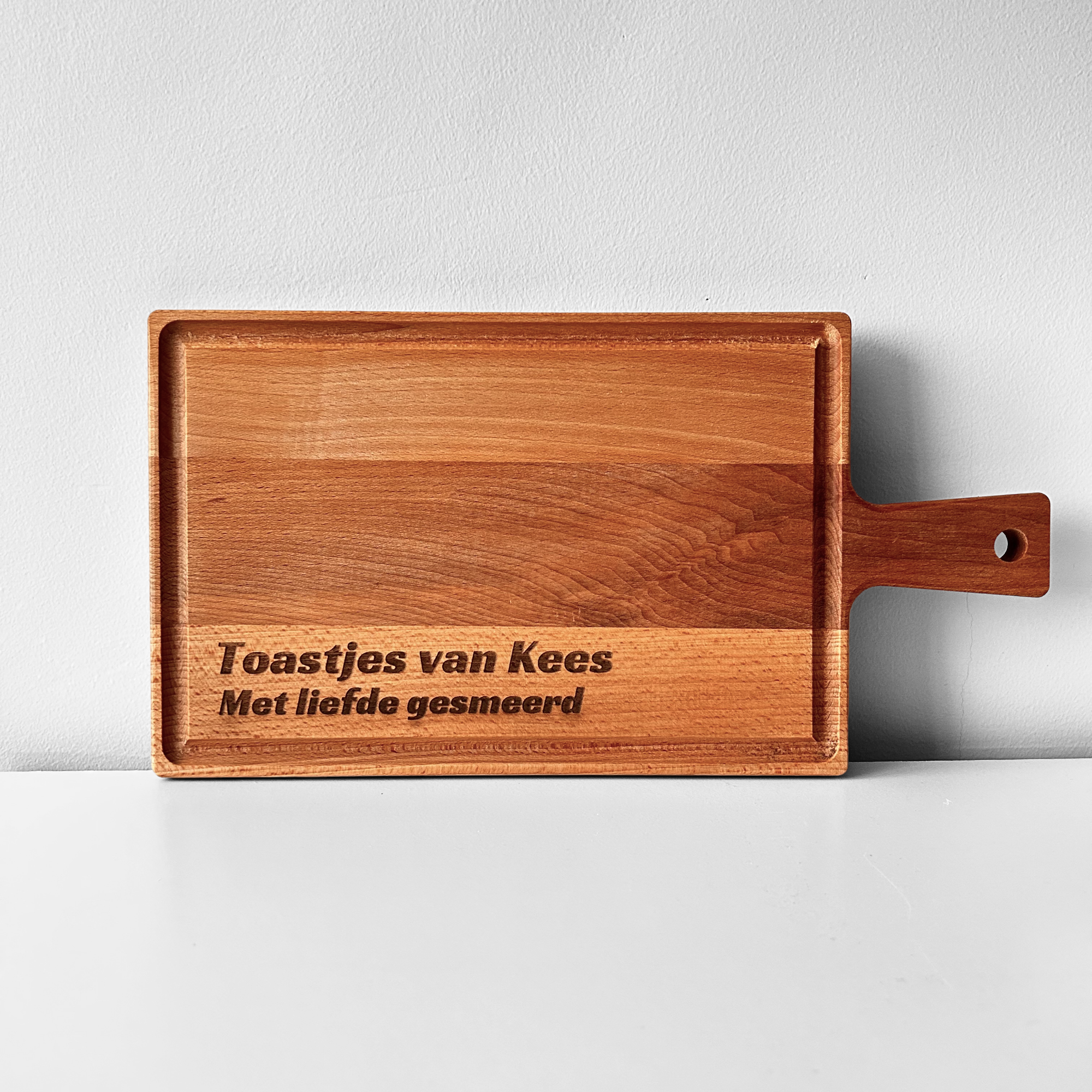 Geef jouw gegraveerde kaasplank de finishing touch met wat oude kaas, geitenkaas, blauwaderkaas, schimmelkaas of wittekorstkaas. Het maakt eigenlijk niet uit welke kaas je voorkeur heeft, met deze gepersonaliseerde kaasplank weet je zeker dat je iets leuks op tafel zet. De beukenhouten kaasplank is niet alleen functioneel, maar ook leuk om cadeau te geven. Zo laat je de kaasplank graveren met een naam, initialen of een speciale boodschap en creëer je een unieke plank die perfect past bij elke gelegenheid.